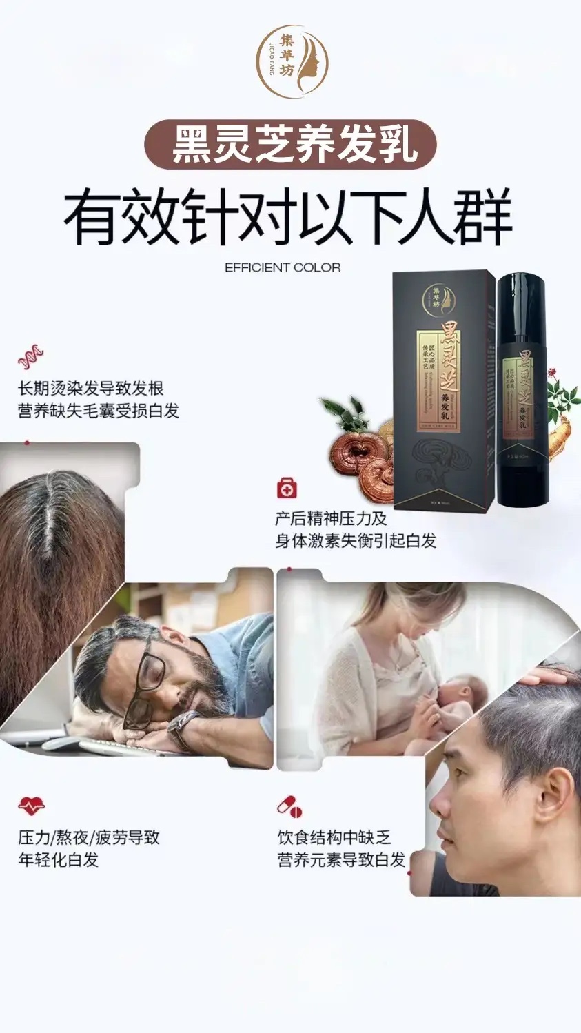 集草坊草本養(yǎng)發(fā)乳的設(shè)計適用于從年輕至年長的各種群體,不論是少年白、老年白,還是產(chǎn)后白發(fā)以及發(fā)質(zhì)受損者,都能從中受益。特別是,它對于染發(fā)過敏者以及孕婦也同樣安全可用,不用再擔心化學成分的困擾。